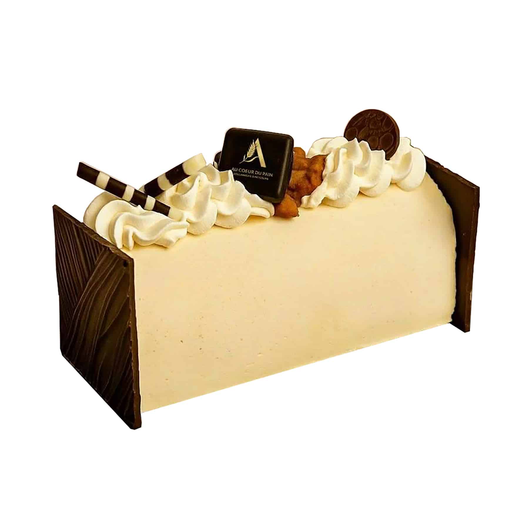 Un doux mariage de vanille et d’une compotée de pommes fondantes au sirop’d’érables un lit de croquant.Une bûche à la fois délicate et réconfortante.
